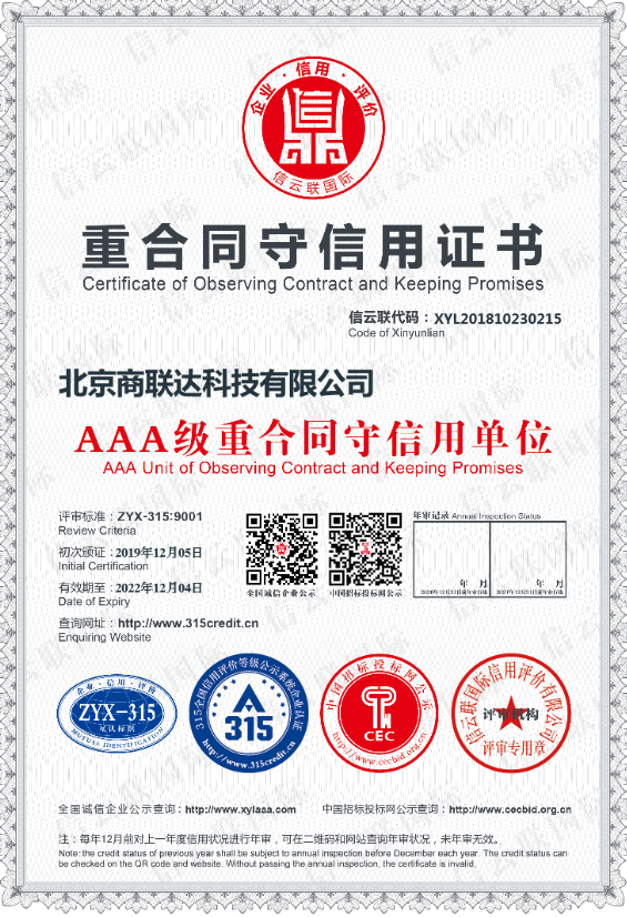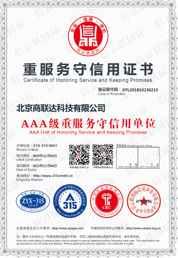 信用是社会经济发展的必然产物,是现代经济社会能够良好运行中必不可少的一环。随着市场竞争的日益激烈,维持和发展良好的信用关系,是一个企业健康稳健运行、持续发展的重要前提。诚信、务实是商联达品牌文化的重要组成部分,商联达的品牌文化源于企业对诚信的忠诚。信用评级是对企业内在质量的检验和考核,做人诚实、做事踏实,做产品诚信,才能从根本上为企业改善经营管理提供动力,让企业在社会竞争中立于不败之地。