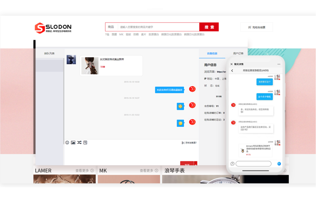 商联达自主研发的平台客服沟通工具IM内置商城,不用单独登录,会员即可与每个商家进行网页聊天。聊天系统支持快捷回复,常见问题,浏览足迹,店铺推荐,多客服接待等功能。