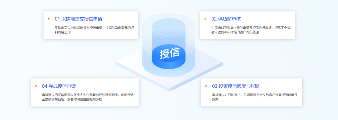 系统支持供货商对采购商进行授信,对订单进行分期支付,并对每一个采购商设置授信额度。采购商下单后,采购商和供应商协商,可设定订单的交付批次及每批次的交付数量。