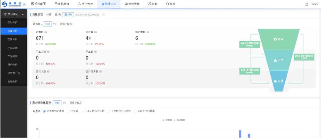 数据统计主要包含:实时分析、交易分析、流量分析、商品分析、会员分析、转化率分析、地域分析、品类分析等。并且支持按照区域、金额、来源终端、日期等维度进行筛选相关数据,提高运营的效率。
